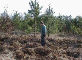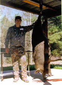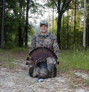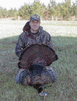 He answered our tree yelps with much excitement.  He gobbled his head off on the roost.  Then he did it.  He flew down on the opposite side of the water (right where I was sitting the prior morning) and moved off into the adjacent pine plantation.  These pines are about 13 years of age and not exactly where you would think of hunting a turkey.  I suspect the hens are nesting in there, though.  We went toward him.  The pines are so thick that we walked 60-70 yards from him and sat down.  He answered everything, but held his ground.  At about 7:00 we backed up and made a half circle around him and sat down again.  He now moved a little closer to us, then began circling us, just out of sight.  He got behind us (we twisted around to be ready), then moved in.  I shot him as soon as I had a clear shot.  He was a 3 year old and weighed 18.5 pounds, with a 10" beard.  There were actually two gobblers in the group.  I never saw the second until I shot and the second gobbler took flight.  I have no idea if I killed the gobbling bird or his companion.