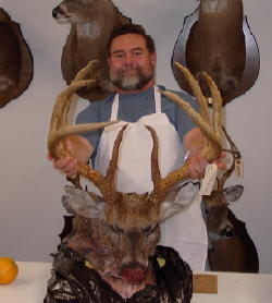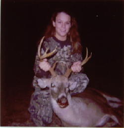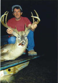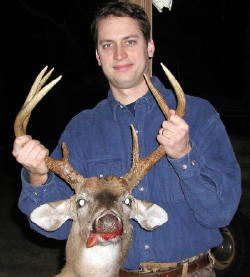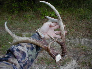 His spread was about 15 to 15½ inches.  He had good brow tines 3 inches long and other tines from 5 to 6 inches.  He had one nub of the beginnings of a 9th point on his main beam.  This buck would score right at 100 or just a little over.  He lacked mass, particularly at the base of each antler, which told me that though he would be a nice bow kill he still had room to grow into something real special.