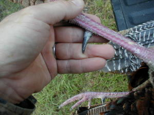 My 3rd gobbler of the season had one good spur and one that appeared to have never reached the potential of its counterpart.  I would guess he was at least 4 years old.  Several months of chasing women had reduced his body weight to a mere 15 pounds.