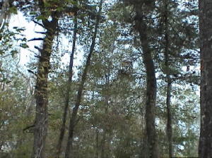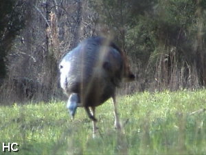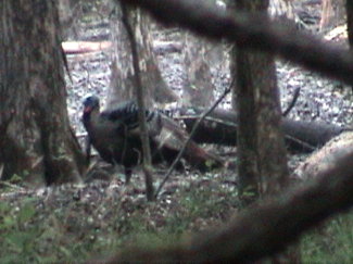 So with the gun in my lap I began rolling some film of the gobbler.  He walked to the left, behind several large trees.  I offered a few light clucks and he finally moved back to the right and stopped behind a tree, crooning his neck around the side and cautiously looking my way.  Finally he walked back to the left and behind the cluster of trees.  A lone hen pitched down in his vicinity and he quickly concentrated on her.  The following photos are of the film I took as he moved into the other direction in pursuit of the hen.