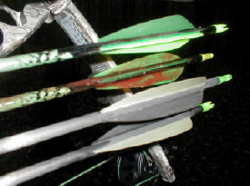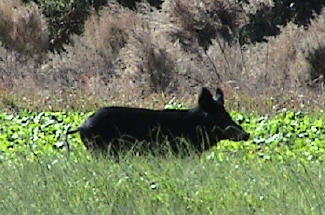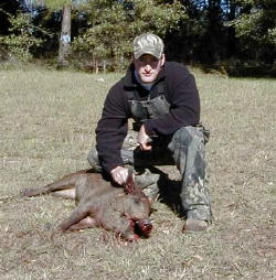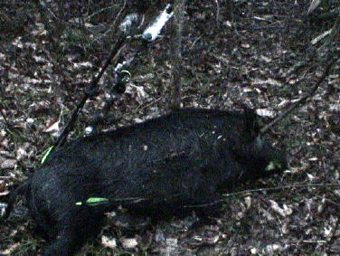 These hogs moved off, seemingly unsure of what the danger was but knowing it existed.  I walked forward to find my arrow and at about that time anther hog, about 125 lbs., crossed in front of me.  It passed by at about 25 yards as well and this time the arrow I fired found its mark.  I saw the arrow hit the hog right behind the shoulder, in the lower 1/3 of his body.  The shot was a complete pass through.  A half hour later I followed a good blood trail that eventually dissipated.  I'm sure he died but I could not find him.