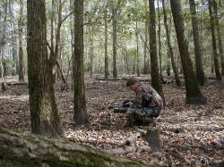 Thursday, completely fed up with Spooky, I was relieved to hear the Dry Pond Gobbler a quarter mile away and I set off to him.  The hardwoods in which he was roosted is bordered by a stand of 15 year old pines and using them as cover I worked my way into position.  It was late before I finally got where I wanted to be and I knew he would fly down at any moment.  I needed to leave the cover of the pines and get farther in the open hardwood bottom but there was no time.  I decided to stay on the edge and take my chances.  That decision would save the bird’s life.