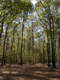 The weekend before last I pinpointed a funnel.  The deer are working a wooded hillside moving between the lower areas of the property (hardwoods) and the upper areas (harvested corn fields and large pines).  The corn is gone and it’s not a factor but this seems to be quite a corridor for deer movement.  The timber is a mix of big pines and hardwoods of various ages.  Many trees are too big for a climber, some are too small, and a few are just right.  Visibility is 100 yards in two directions and about 50 in the other directions.