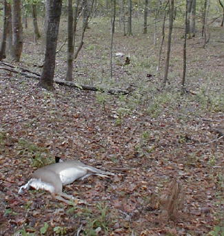 Somewhere between 4:30 and 5:00 PM I saw the first of four does working my way.  I had been listening to the AU-Miss St. game on my walkman and I quickly put it away.   One of the does finally presented a shot at 12 steps and I delivered a perfect lung shot.  She fell about 30 yards away.