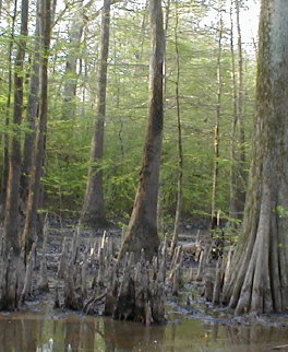 It has been another gorgeous week for turkey hunting.  On Monday I hunted with a friend in another nearby riverbottom swamp.  We heard several but there were too many low bogs between us and the gobblers and when we did try to move closer to one we must have spooked him there in the open area of the woods.  Where we hunted was a beautiful stretch of hardwood timber with countless cypress knees rising up from the forest floor as shown in the accompanying pictures.