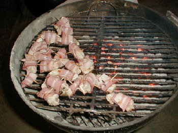 My wife and I enjoyed the wild turkey breast this week that I bagged last Friday.  My favorite way to cook wild turkey is to cut the breast meat into cubes and wrap them in bacon.  I prefer turkey bacon as it is much leaner.  (The bacon I used this time was a little thicker than I normally buy.  It seems the thinly sliced is the best to use.)  I then marinate the meat in Italian dressing for 2 to 3 days before grilling it.  It is best to cook the meat over indirect head to keep the marinade and the bacon from causing too much flaming.  You also don't need to cook the meat for very long at all.  Be very careful not to overcook it as it will dry out quickly.  The meat will get done before the bacon.  Be sure not to cook until the bacon is crisp!
