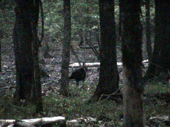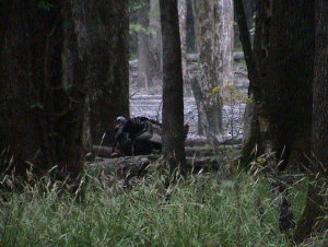 Sunday was entirely different. 3 birds started up early & one was interested. He came readily but hung up at a creek drumming & gobbling. Meanwhile I was trying to conceal myself with a bow in an area that was entirely too open. Without realizing it 2 hens came up from my rear & busted me but the gobbler kept on sounding off. He was fired up & wanted it badly but wouldn't cross the creek. We had a pretty intense courtship for about 30 minutes that finally ended when my friend decided to chop some wood for the fire as I was only a short distance from camp. So much for my bow hunting adventure.