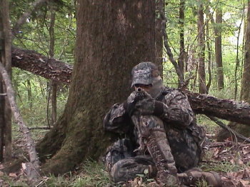 Ten minutes passed and I was resigned to chasing the primary gobbler and ready to move closer to him and try to turn his retreat.  Matthew saw the silent gobbler approaching to our right before I saw him.  He was angling toward us through the thick, 15 year old pines.  Matthew twisted around with the help of our makeshift blind and readied for a shot.  The bird stopped at 28 steps, behind several trees. I could only see part of him sticking out around a big sweetgum.  Matthew could see no more of him either.  The bird stood and apparently looked for the hen for about a minute, then turned and walked back in the directly he came.  He began clucking and I responded with some clucks of my own but to no avail.