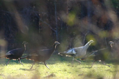 Another minute passed and my bird began flopping.  My father suggested I might better go get him before he got way, if he happened to not be hit as well as needed.  I stood up and began trotting toward him and suddenly I see turkeys running my way.