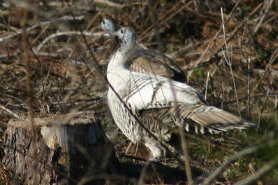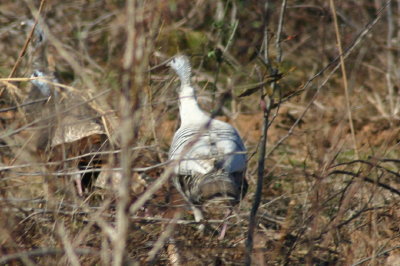 So again we go on the move.  A short way into the semi-circle I heard the drum of a gobbler.  I stopped immediately.  Sight is limited in these woods.  It is possible to catch glimpses at 40 to 50 yards in some areas but most views are limited to 30 and under, therefore, walking right up on the turkeys without being seen was possible.  That is what we did.  We almost ran right over them again.  While still standing we saw one gobbler and then another in full strut.  Luckily, due to the dense cover, we were able to sit down.