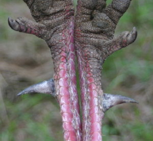 Finally they moved off into the pines and I recovered my gobbler.  I was excited to see his long spurs, one measuring an inch and a quarter and the other an inch and three eights.  For someone that is used to taking 2 and 3 year old birds, I was excited to get this one.  This is one of the best birds I've ever killed as far as spur length and age.  He weighed 18 lbs. and had a nine and a half inch beard.