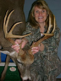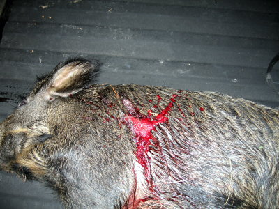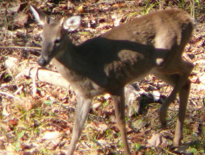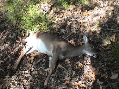The shot was bad.  It hit her high and a little far back---guts.  She ran 50 yards through the hardwoods and stopped in a clearing where I could see her.  Just as I told myself she would be tough to recover she simply fell over dead.  Apparently the 2-inch expandable had hit something of quality though it completely missed the heart and lung area.