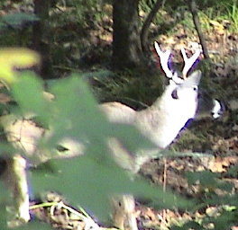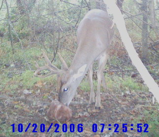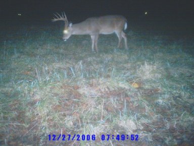 This buck passed right under my tree but was too close to get a picture, fearing I might spook him with any movement.  I took this grainy picture with him feeding about 75 yards away.