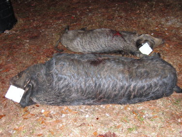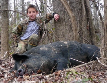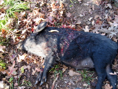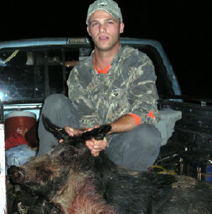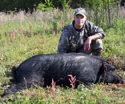 Harvey Crawford writes, "It took SIX, 3 1/2" 12 gauge Winchester supreme turkey loads with a Remington extra super full choke all at 20 yards to finally point blank range to bring this beast down. I was walking a trail down the AL river bank when I met up with this hog.  We both stopped dead in our tracks as we seemed to see each other about the same time.  I was turkey hunting so I had to make a quick decision whether or not to shoot him and ruin my turkey hunt for the morning.  The first shot was head on at 15-20 yards.  It stunned him out of his mind for a few seconds then he made a bolt across the big field in the background towards the cypress swamp.  Chasing him at full speed for at least a hundred yards across the big field while shooting from the hip the next three shots, all within 5-15 yards of him.  I had to stop.  I couldn't chase him anymore, I was out of breath as bad as I have ever been.  I couldn't believe that he was still going like I hadn't even hit him once.  I was close enough to see that all my shots had hit him each time with dust clouds coming off of his body each shot. Knowing that it was a tight pattern at that close and still not penetrating his hide I gave up chasing.  I watched him make his way across the field into the little pines as I put my two extra shells in my gun.  Very disappointed that I had lost my turkey hunt and the big hog too, I started my walk back to the truck when to my amazement here he was coming back towards the river where the first shot took place.  Taking off running after him I knew that I had to make these shots count and that they would have to be extremely close.  Bam, the fifth shot on the run from the hip and he just took it like a man.  Not once did he ever squeal or fall down from any of the first five shots.  That's what I'd call tough as nails.  One shell left and "give out", still on the run I stuck the barrel out to point blank range behind his big ol' ear and pulled the trigger.  He didn't just fall over, he took a nose dive and bit the dirt.  Finished for sure he still managed to sling dirt on me as he spun in circles.  No doubt about it, the most exciting hunt I have ever had.  I can't imagine one any better.