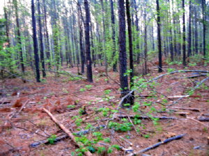 The Sunday morning hunt was one I would like to forget.  In the predawn darkness we crept to the edge of a stand of young pines, recently burned, where they border some larger timber on a gradual downward grade to a small stream.  We surmised the birds were roosted in the larger timber and that they would head toward the field behind us when they pitched down.  We split up, which can be very dangerous in the turkey woods and is something I would not normally recommend unless you and your partner are going to be a great distance apart.  We were not, yet we were careful to know where the other would be sitting and know that shooting in that direction was off limits, even if that meant the bird would get past us.