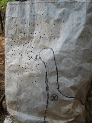 I was pretty sure he would fly down into the field and I set up accordingly, just inside the tree line.  The woods there are young planted pines that offer no help in disguising one's silhouette.  I clipped as many branches as I could from a nearby oak tree and make a quick blind around me.