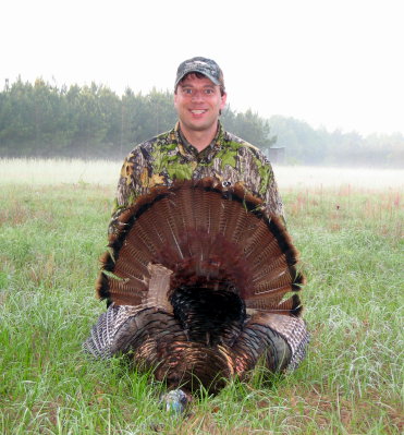 Eleven year-old Madison Anderson, of Chatom (brother of Thomas in picture above) killed his first turkey this season as well.  The shot was made at 16 steps with a 16 gauge.  After the shot the bird took the air and died in flight.  He got hung in a tree and Madison's father, Stevie, had to cut down the tree with a chain saw to retrieve the gobbler!