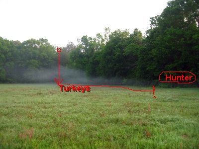 I few minutes later he gobbled again, on the ground and in the corner of the field about 50 yards away, out of my view through the thick cover of the overhanging limbs of a oak tree in front of me.