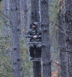 I climbed a big sweetgum tree overlooking a hardwood bottom early Saturday morning. I saw only 3 deer, all does, but one of those came right by me and I made a lethal shot at 8 yards.
