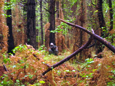 The shot was fired and the bird took off running away. I started to get up expecting us to have to chase him down but then I heard the gobbler begin to putt. He then slowed his walk and I began cutting at him. I then gave him a couple of gobbles, awful as they sounded, but what the heck we couldn't scare him much more at this point. I then cut at him again and he gobbled back, now at a distance of about 75 yards. I caught his movement for a few more moments as he walked away. It was a clean miss.