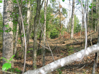 We set up to cover this bottom and the road shown below, not knowing which way the gobbler might approach. He chose the bottom shown above. If you look right hard in the upper center of this picture you will see Andre standing beside the fallen gobbler.