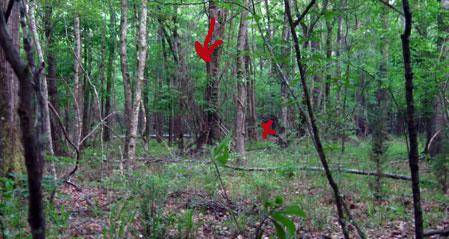 The bird stopped behind the big tree and vines shown under the arrow. He finally walked forward and the shot was made at the X mark.
