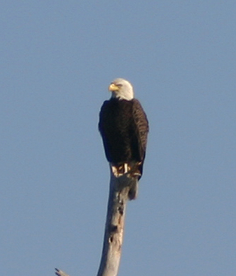 This past weekend my friend "Big Daddy" Lawler and I were crappie fishing on the lake here and spotted a bald eagle in a tree. Quite a few eagles now reside in the area thanks to a restocking effort that began some years ago. I never take for granted anytime I see one of these majestic birds. A symbol of our nation, they were almost gone from the earth. These are the best photos I have gotten of one of our area's eagles.