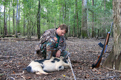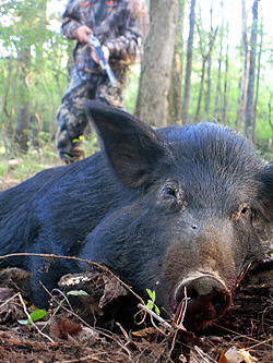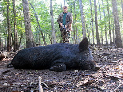 I soon reached the area with the most acorns and there I found two hogs feeding along. The more distant one moved away quickly so I had to go ahead and take the closest one while the chance was available. Then another hundred yards farther I spotted three hogs working their way towards me. I sat down and waited. Two of them came within 15 yards of me as the other fed at 40 yards. Again I took the more distant hog and then downed the closer ones with the second and third shots. Farther ahead I spotted the largest hog I had seen all morning, a lone boar. With the wind in my favor I slipped within 50 yards of him and dropped him in one shot.