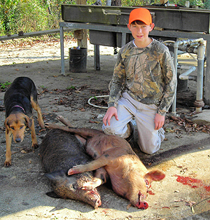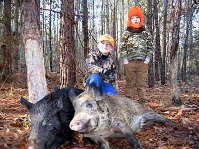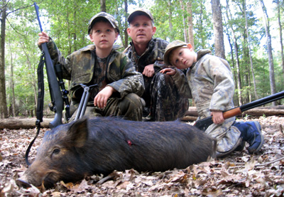 Saturday afternoon Rick Williams and his sons Ed and Rhyne joined me on a hog hunt. Eight year-old Ed was fired up to be on his first hog hunt. Having already killed deer and turkeys, I was confident Ed would make a good shot if the hogs would cooperate. Ed's gun of choice was his deer rifle, a scoped .243. His brother Rhyne provided back up with his BB gun and also promised to keep away any squirrels that threatened to give away our position.