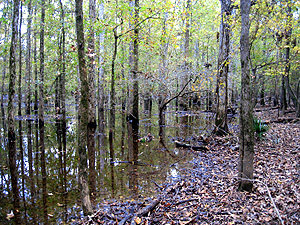 12/22/2009Access to some areas of the property this past weekend was impossible due to the backwaters of the Alabama River. The river is expected to crest at a level of near 74 feet today, two feet higher than the high water from last month, and then begin a gradual fall. Three feet higher than this level and the water comes over the access road well before you reach the swamp.