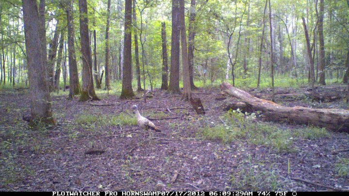 August 14, 2012 This week I have another Plotwatcher video from one of the barrel feeders. The amount of corn had gotten real low and the hogs were having no trouble rolling it around at this point. Even the smaller pigs could do it. The pig pipes are working well, though they can drain the corn from one of them in just a few days. I also got the best picture so far of one of the white hen turkeys.