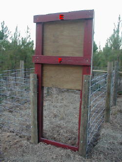 Flip over the door frame so that the side that will be on the inside of the trap will now face upward. Insert the door, sliding it in from the top of the door frame.Next, you will attach one more board (2" x 2" x 42") [H] cross ways on the door frame for the trigger rods to rest on. Move the door to the "closed" position and nail this board just below the block on the door frame, so that the board does not interfere with the falling of the door.